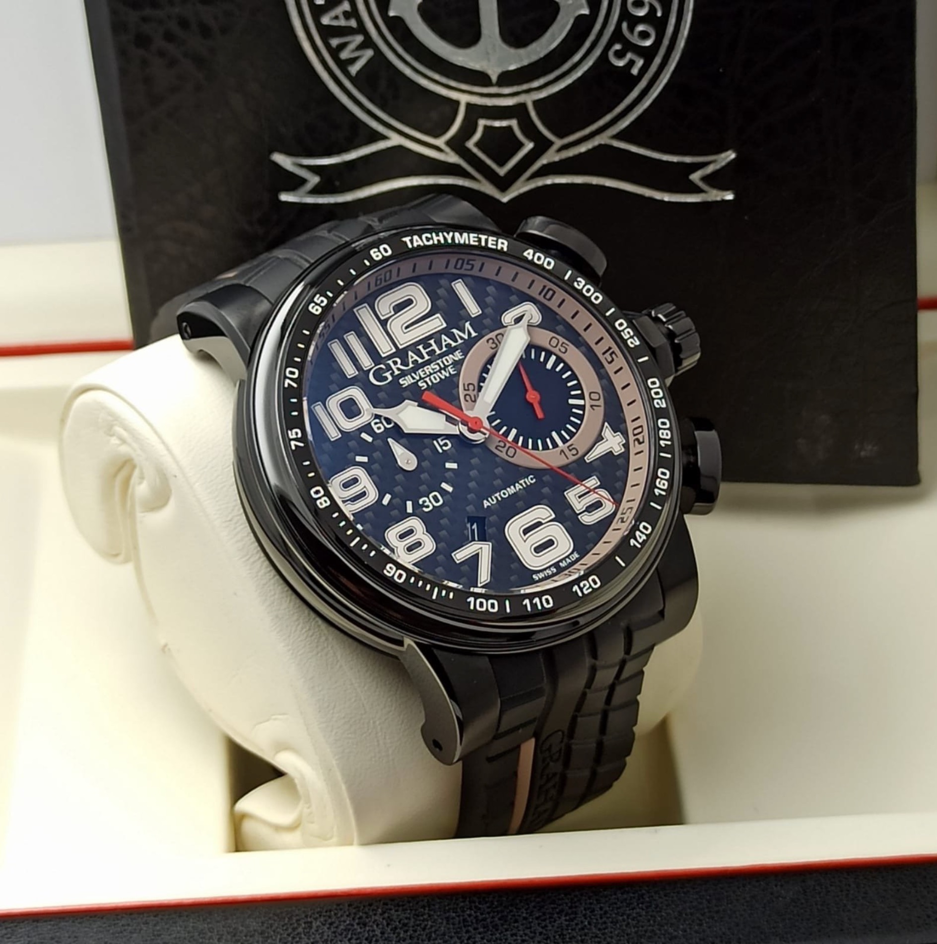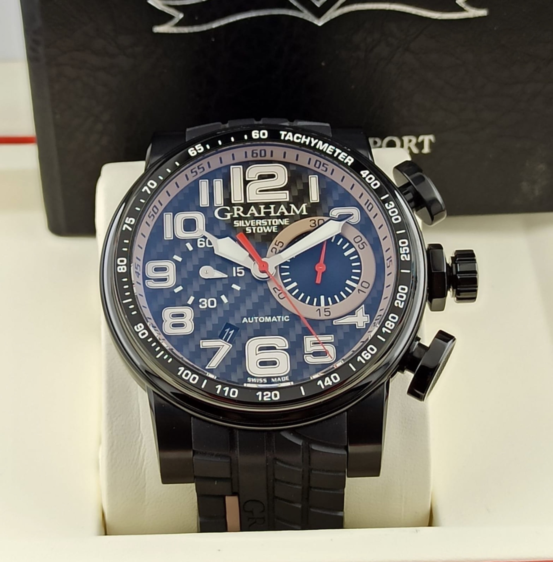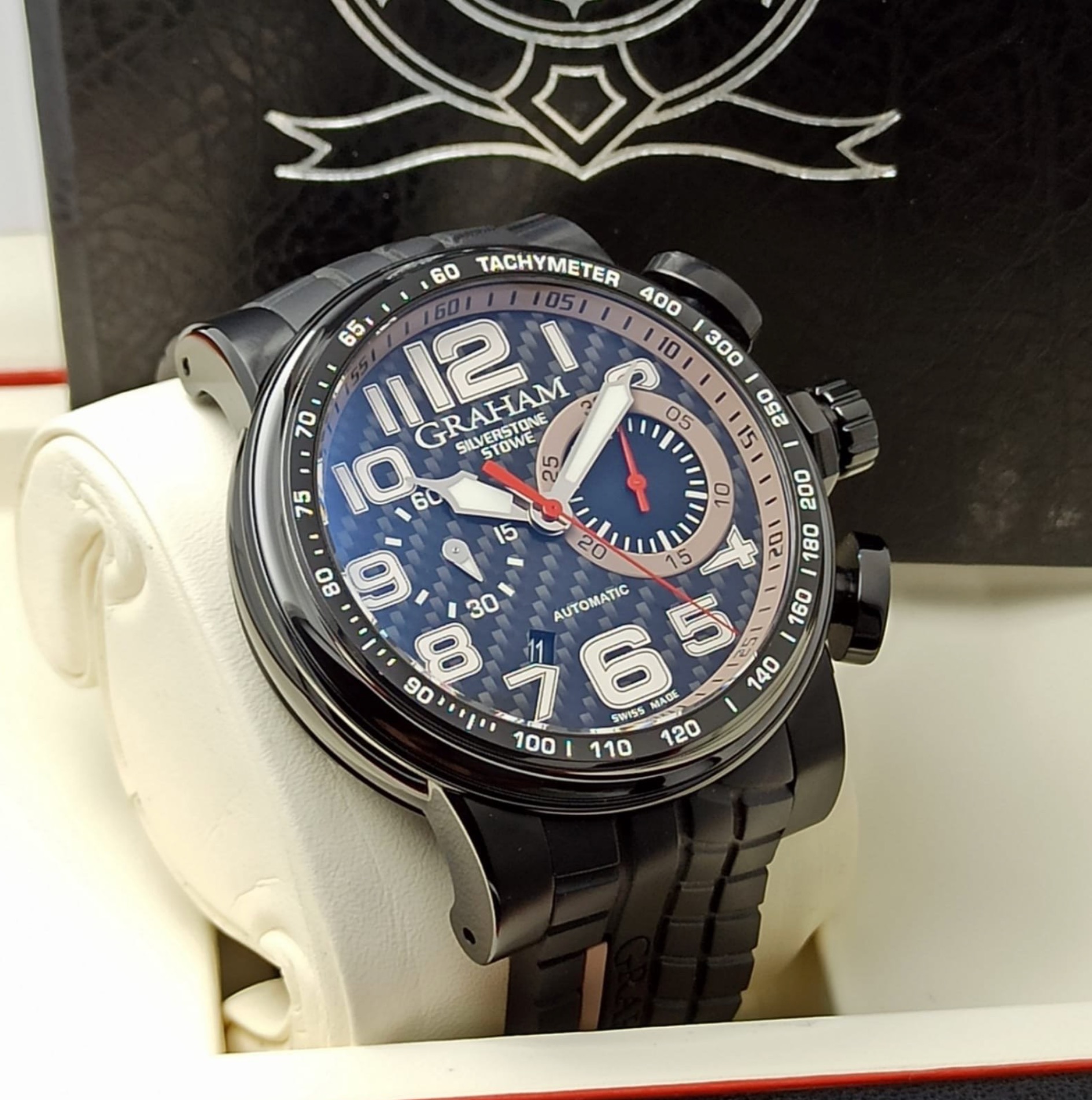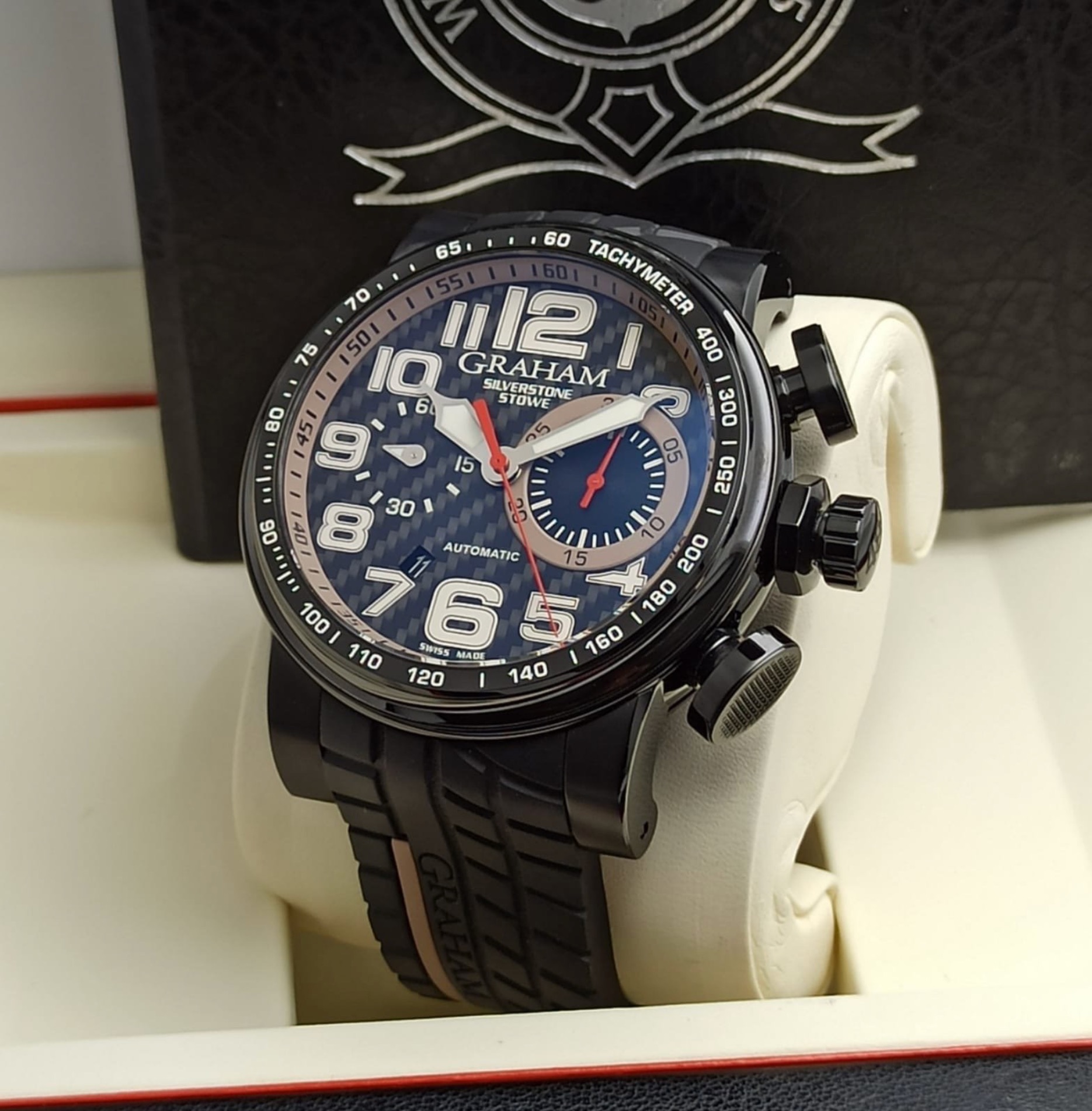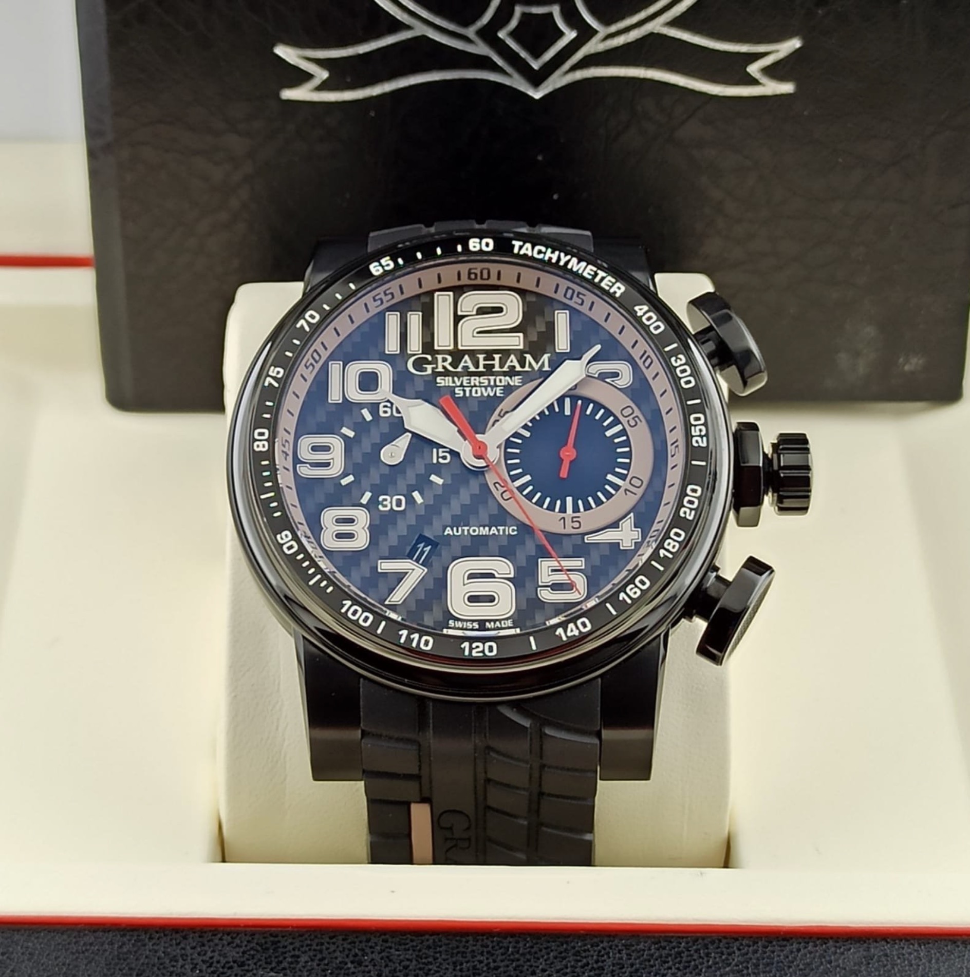 Black ceramic, black PVD steel internal rim with tachymeter scale. Black carbon fibre dial. Bracelet: Black tire-track with GRAHAM hallmarking