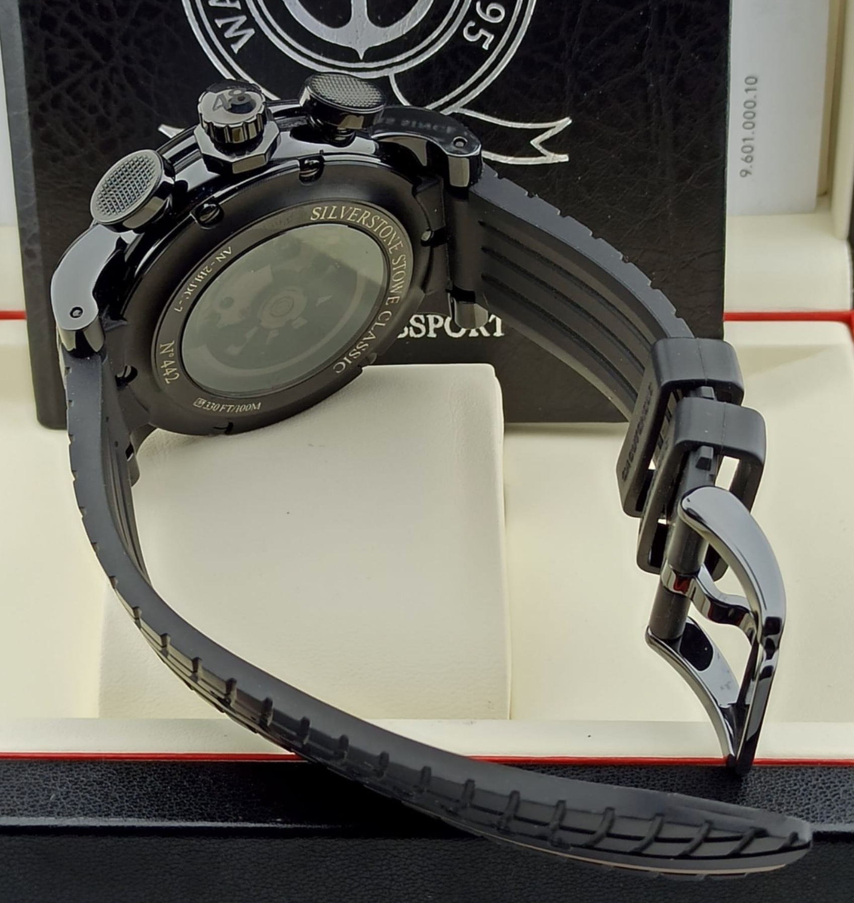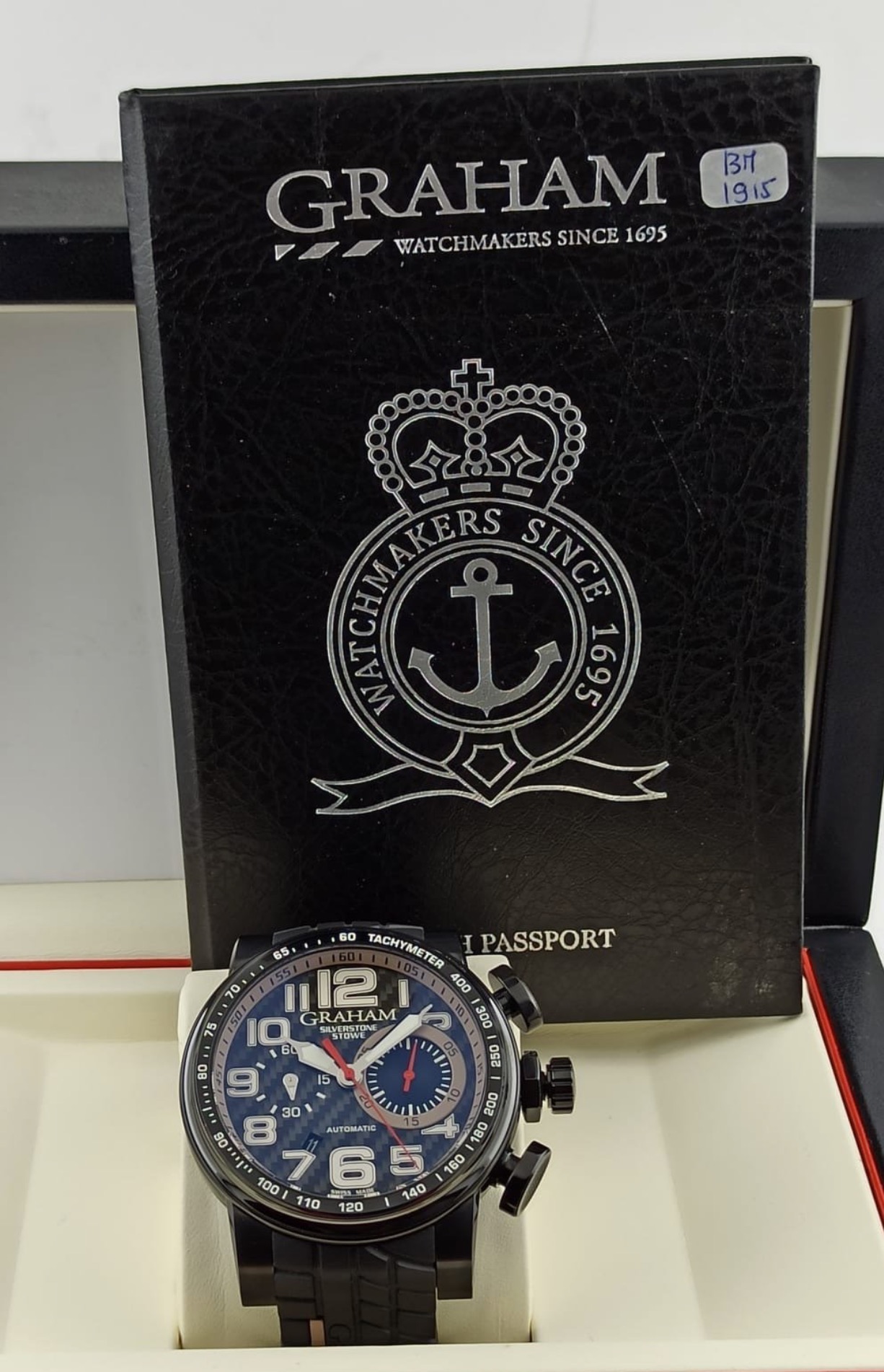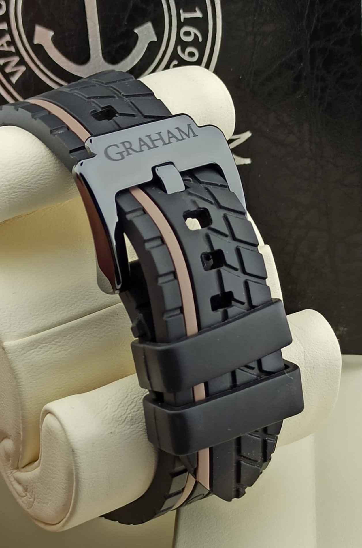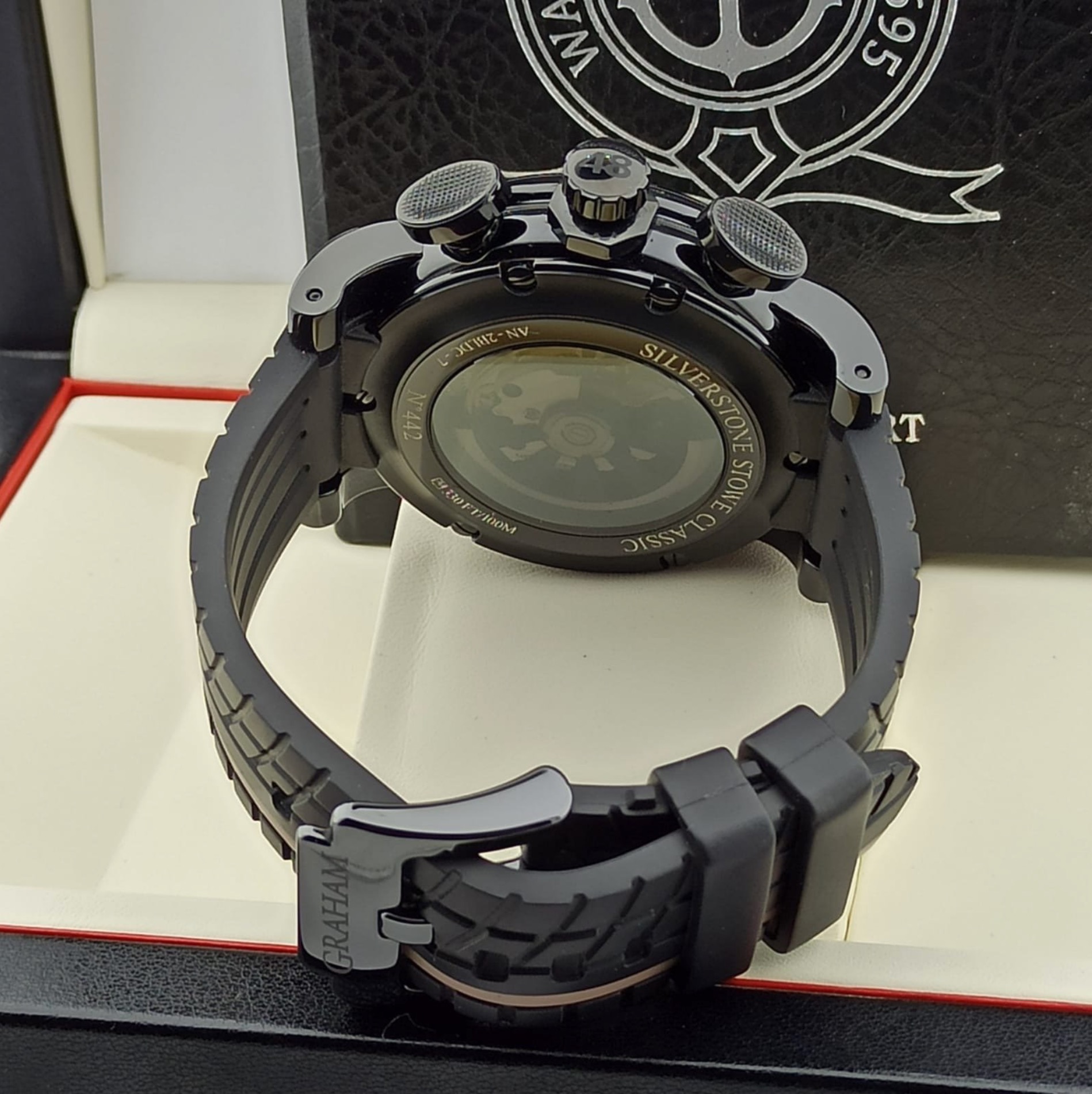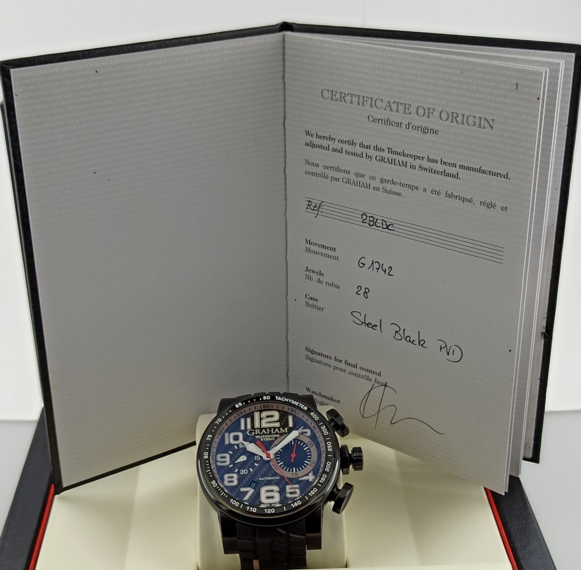 Black ceramic, black PVD steel internal rim with tachymeter scale. Black carbon fibre dial. Bracelet: Black tire-track with GRAHAM hallmarking