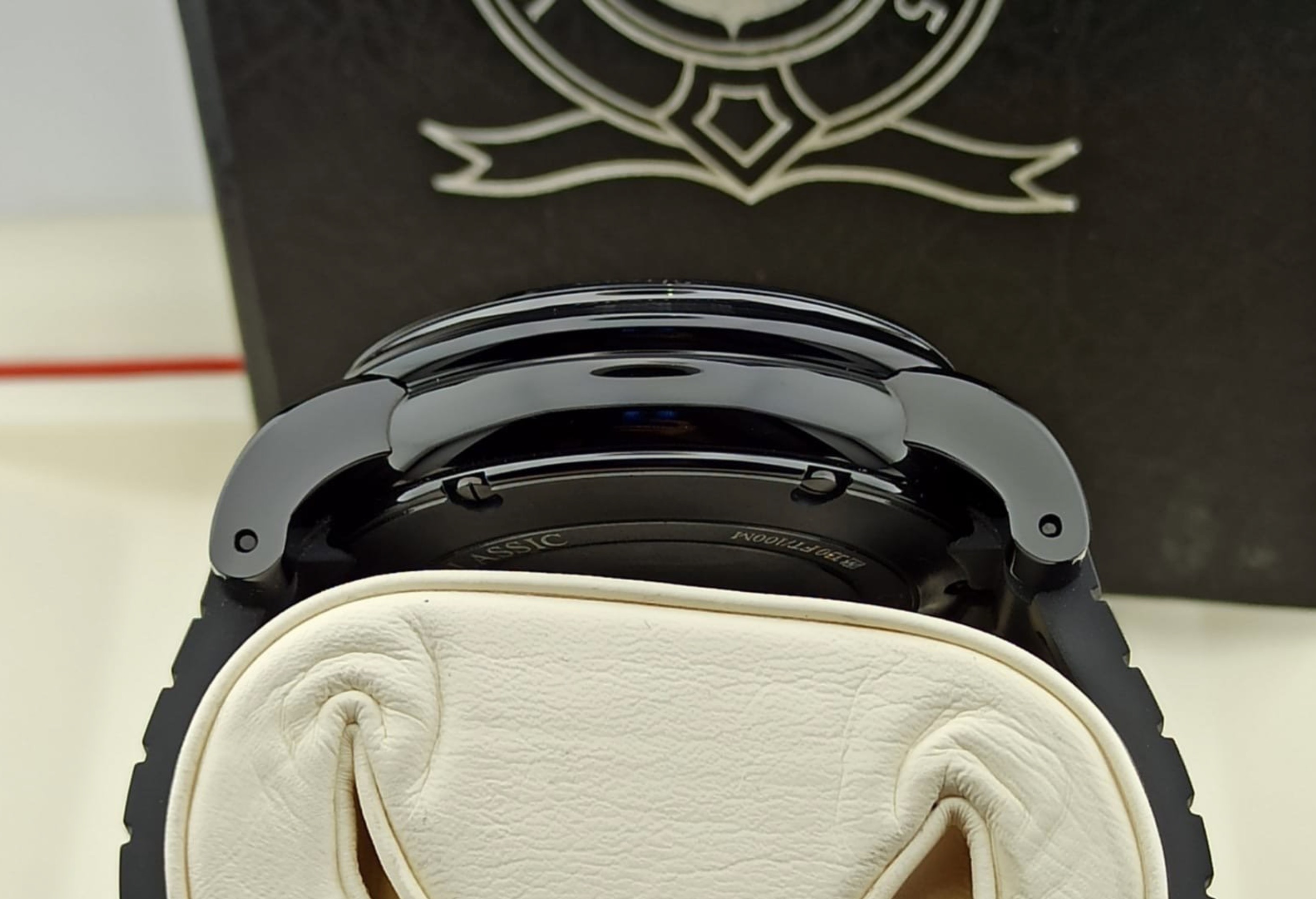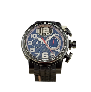 Black ceramic, black PVD steel internal rim with tachymeter scale. Black carbon fibre dial. Bracelet: Black tire-track with GRAHAM hallmarking